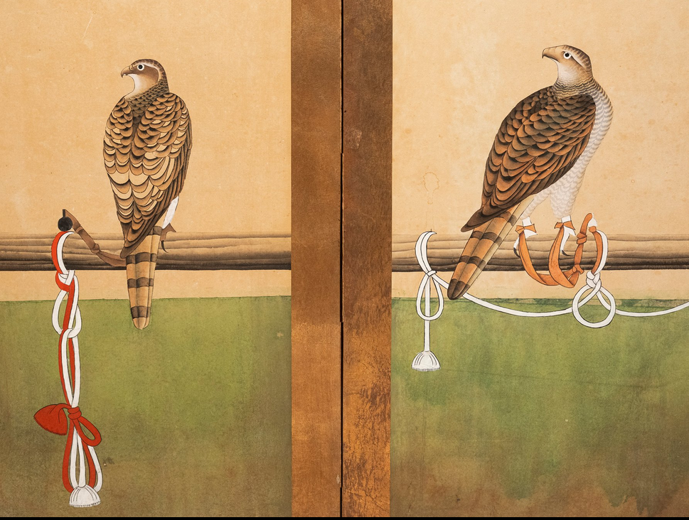 A two-panel painted paper screen depicting two falcons on perches