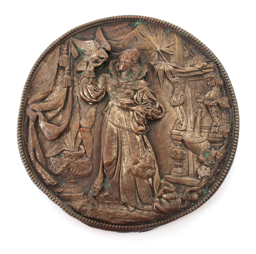 Copper plate 'Hunter with falconry' Beginning of 20th century. Copper. Diameter 21.5 cm