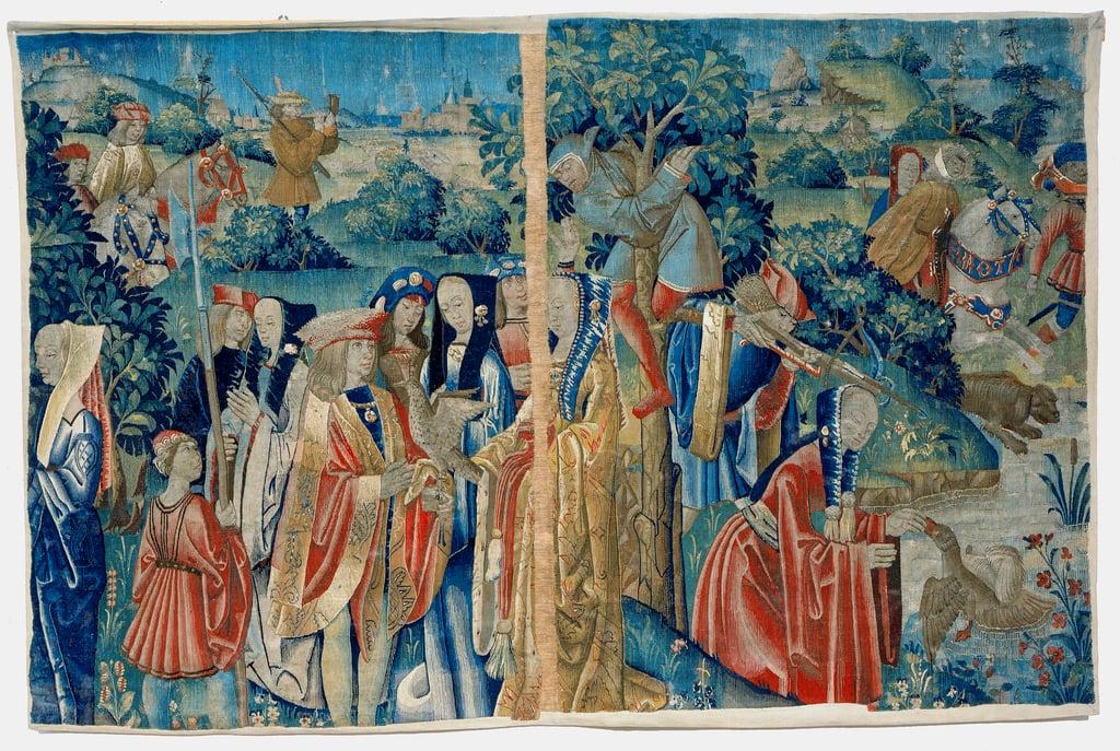 Count Guy leads Harold to Beaurain where he holds him, Bayeux Tapestry (wool embroidery on linen)