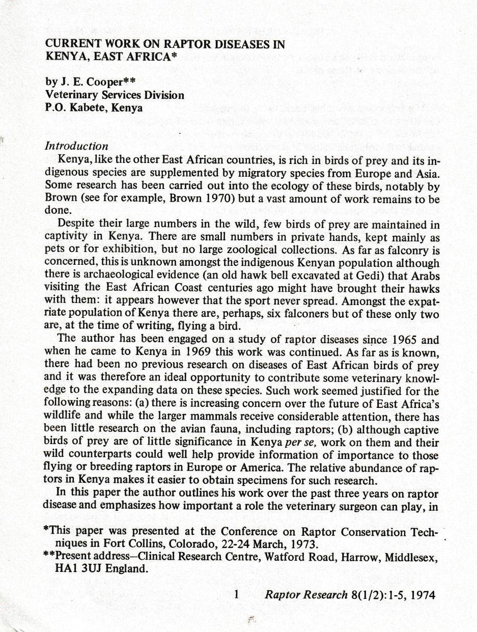 Current work on raptor diseases in Kenya, East Africa - Raptor Research 1974
