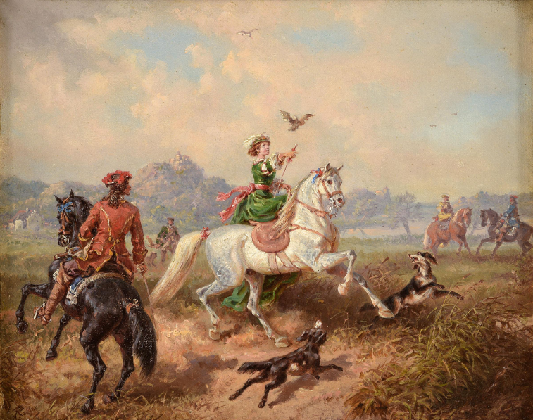 Elegant hunting party during falconry by Friedrich Kaiser (1815-1890)