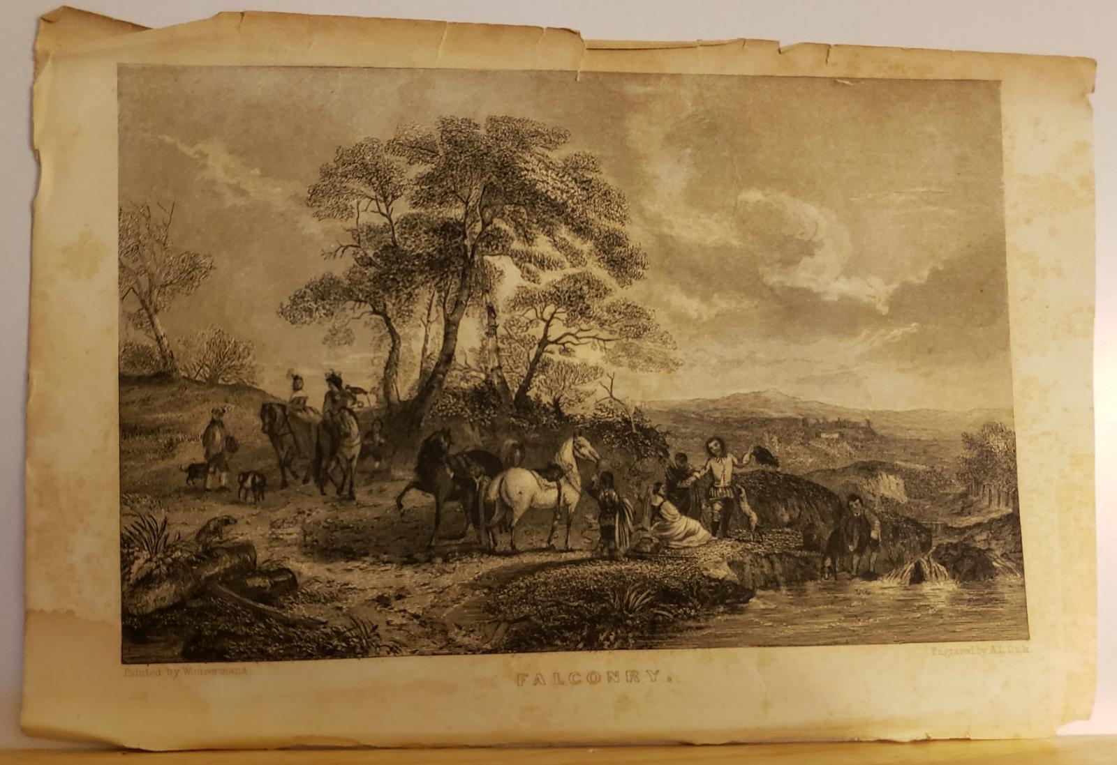 Falconry scene. Engraved by Archibald L. Dick, 1805-55 (USA and Scotland). Likely from the book Ladi