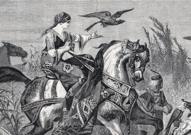 Falconry with Golden Eagle. Kyrghyzstan. Pre-revolutionary engraving from journal 1877 from statuette by Lancere