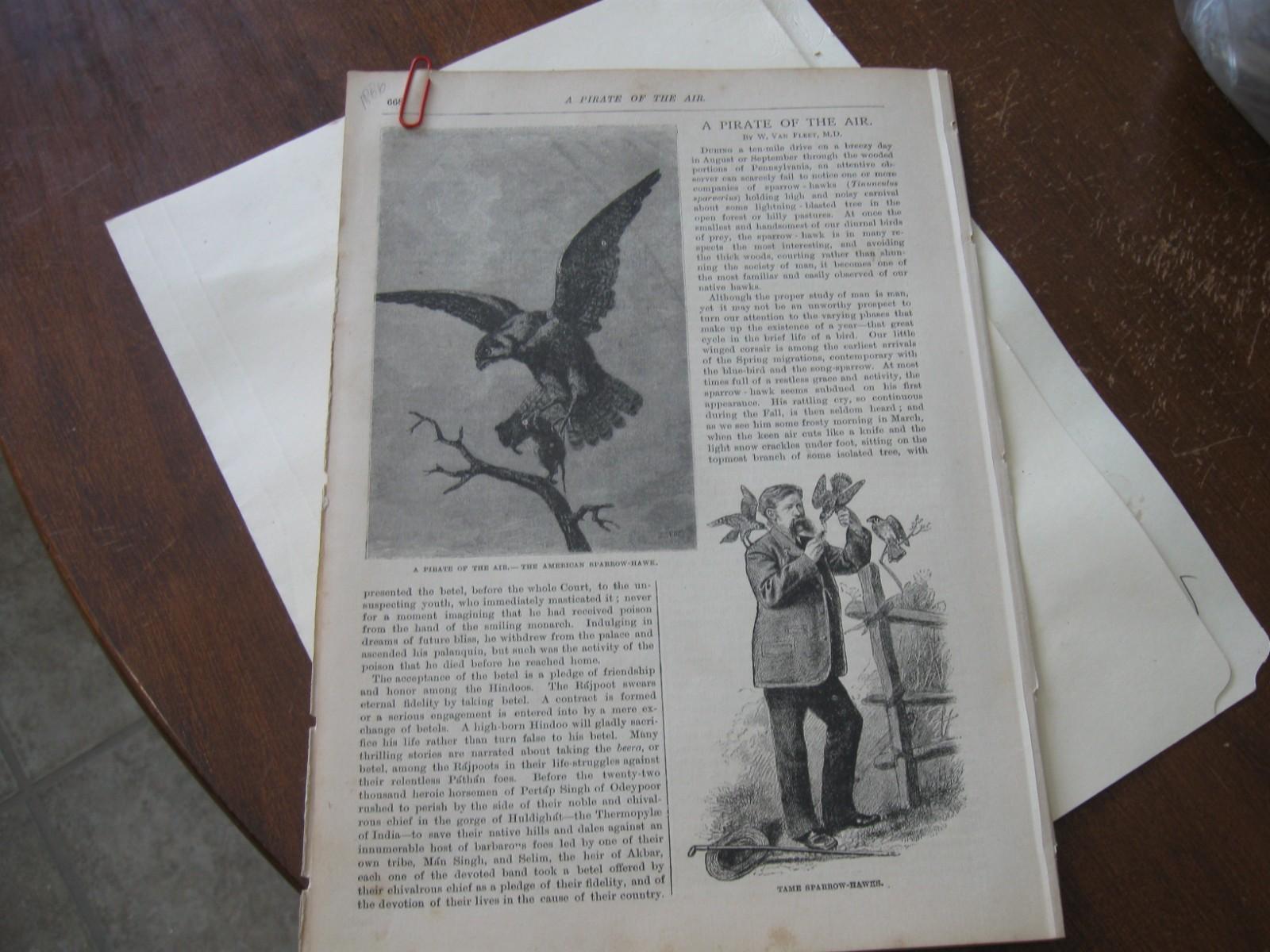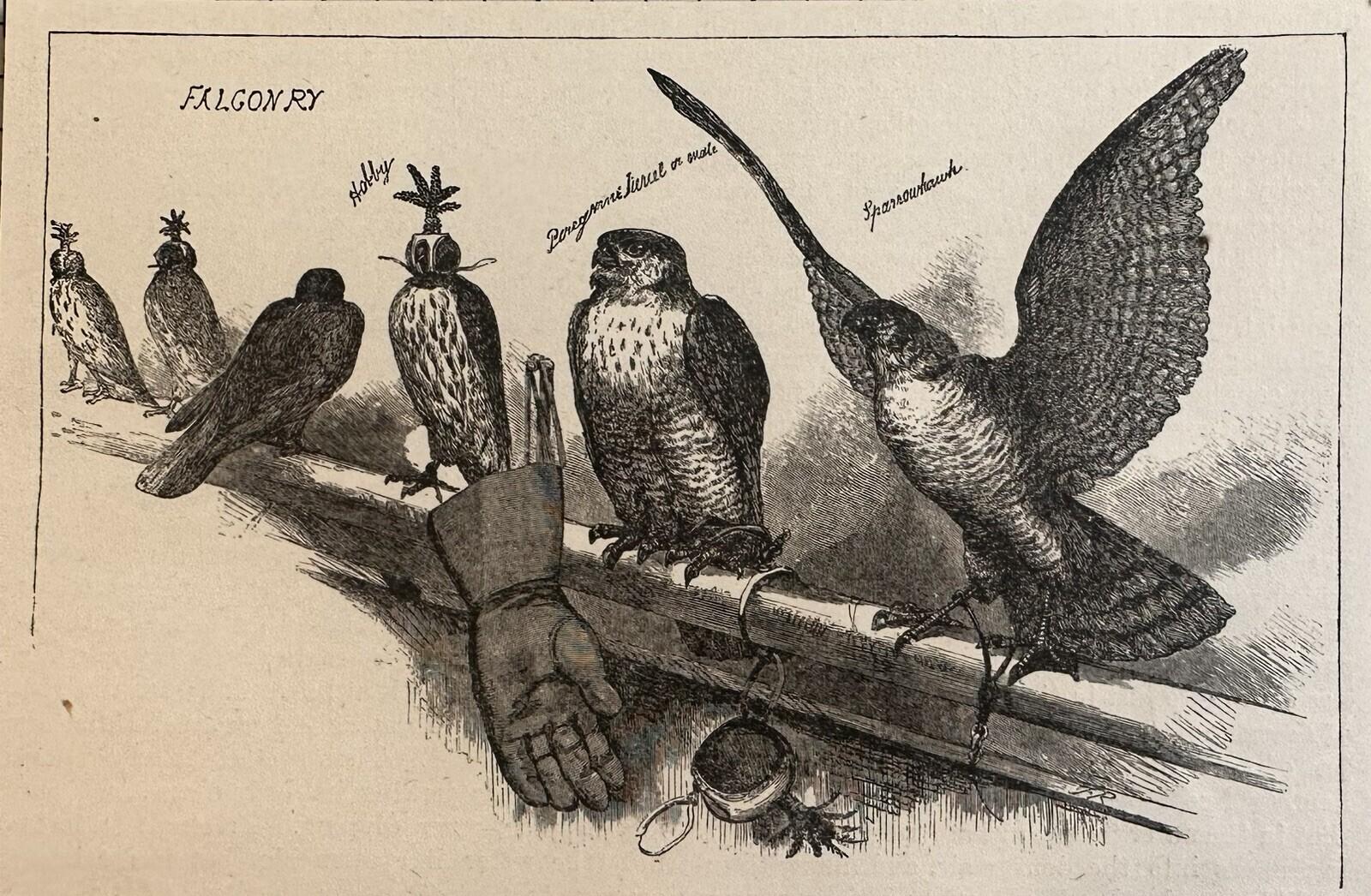 1892 Falconry Antique Wood Engraving Sparrowhawk Hobby