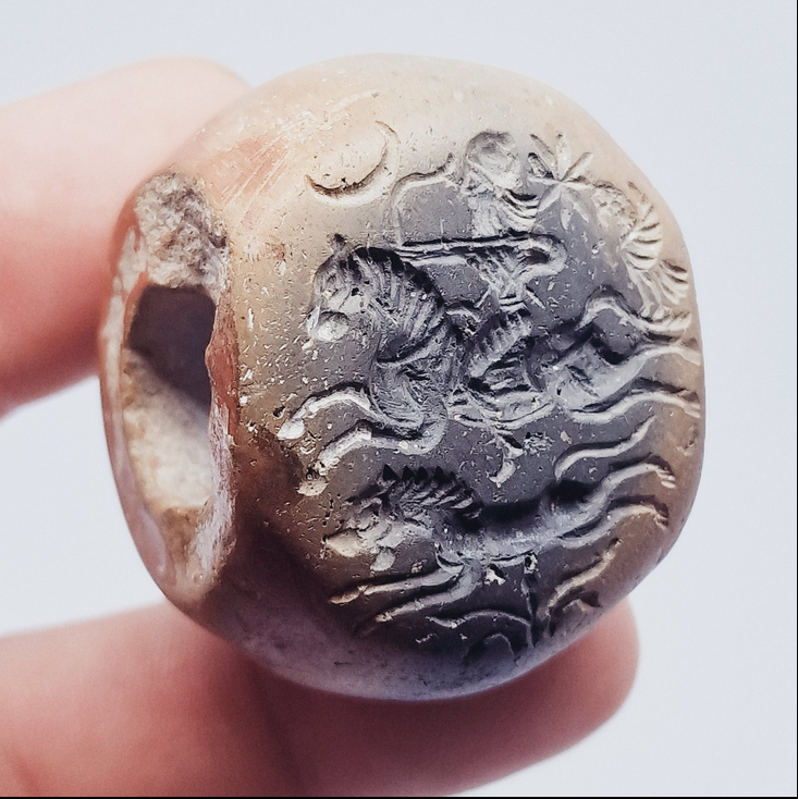 Indus Valley Ceramic Hunting Scene w. Dog & Falcon Bead Talisman Seal - 38 mm