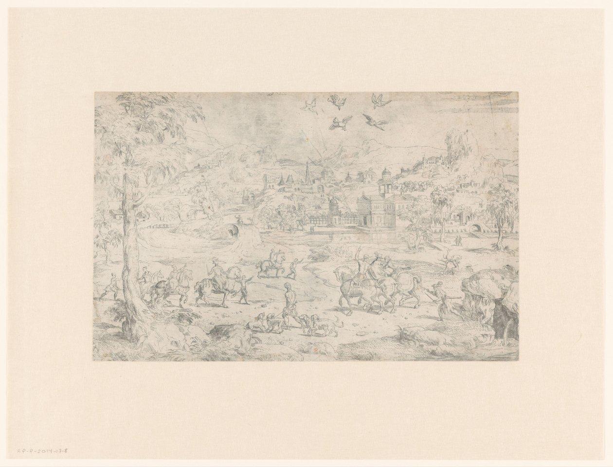 Landscape with hunters by horseback on falconry by Johann Salomon Wahl