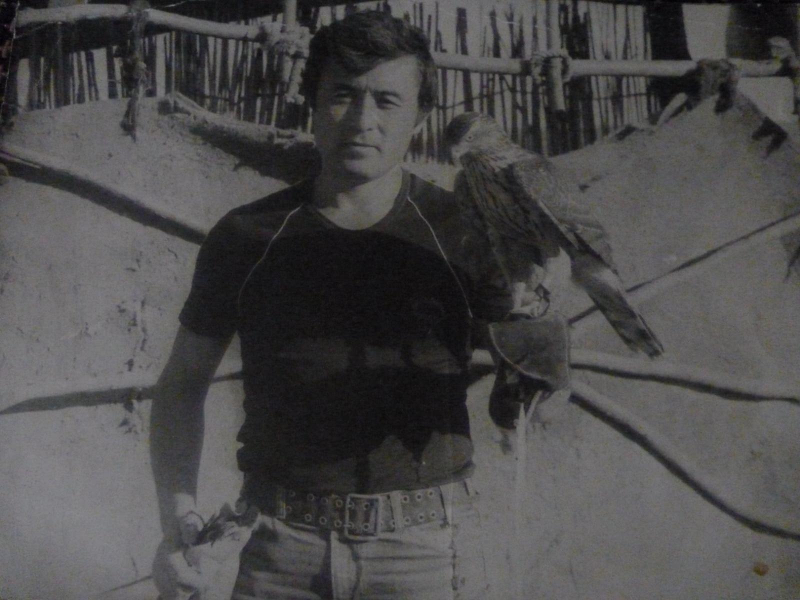 Man posing with birds of prey eagle falconry profession - Old photo