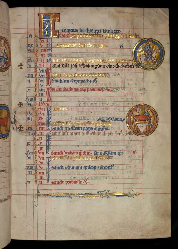 Ms 19 May: Gemini and a man hunting, from a Book of Hours, early 15th century