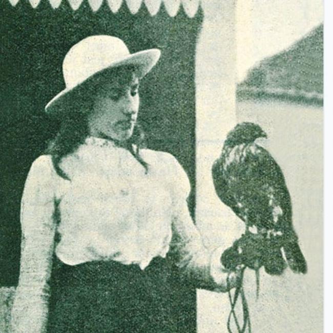 Princess Nirgidma with her hooded hunting eagle at Urumchi.