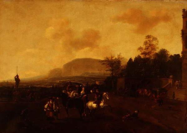 A hawking party in a mountainous landscape by Dutch artist Johannes Lingelbach (1622-1674)