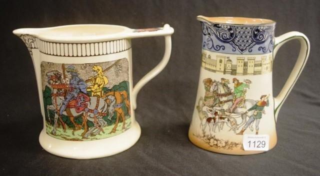 Two Royal Doulton series ware jugs to include Falconry, and King Arthur's knights D2961, height 17.5cm approx (largest)