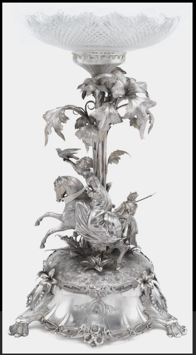 A Silver centrepiece with a Falconry scene, circa 1850.